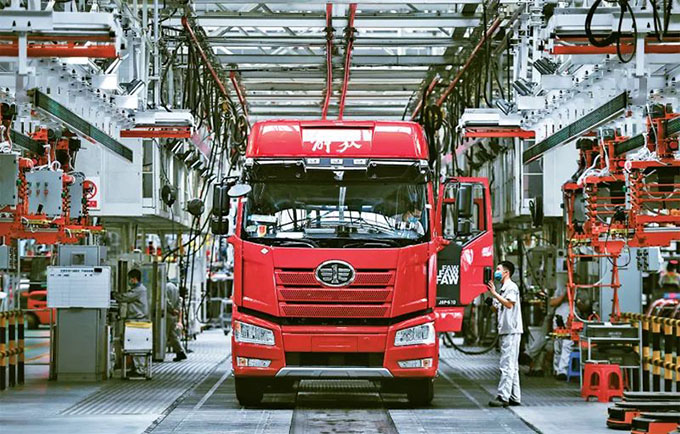 企業(yè)強則國家強,加快建設(shè)世界一流企業(yè)是全面建設(shè)社會主義現(xiàn)代化國家的重大任務(wù),是新時代國有企業(yè)的戰(zhàn)略目標。近來,一汽解放集團股份有限公司生產(chǎn)按下“加速鍵”。圖為2022年6月15日,工人在位于吉林長春的一汽解放總裝車間內(nèi)裝配車輛。 新華社記者 許暢/攝