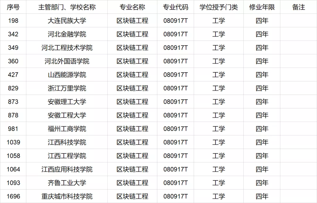 隨著區(qū)塊鏈在行業(yè)發(fā)展初期迎來短期爆發(fā)式的增長,必將面臨行業(yè)相關(guān)人才儲備不足,從業(yè)單位用人難的問題。為此,2021年2月10日,中華人民共和國教育部《關(guān)于公布2020年度普通高等學(xué)校本科專業(yè)備案和審批結(jié)果的通知》(簡稱《通知》)中公布,我國共有14家高等院校,申請開設(shè)了“區(qū)塊鏈工程”本科專業(yè)課程,持續(xù)為行業(yè)輸送后續(xù)力量,區(qū)塊鏈人才短缺問題,將在幾年后得到有效緩解,并持續(xù)為行業(yè)輸送后續(xù)力量。本次公布的14家高校分別為大連民族大學(xué)、河北金融學(xué)院、河北工程技術(shù)學(xué)院、河北外國語學(xué)院、山西能源學(xué)院、浙江萬里學(xué)院、安徽理工大學(xué)、安徽工程大學(xué)、福州工商學(xué)院、江西科技學(xué)院、江西工程學(xué)院、江西應(yīng)用科技學(xué)院、齊魯工業(yè)大學(xué)、重慶城市科技學(xué)院。