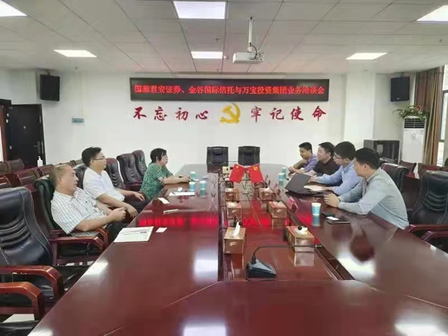 9月29日,國泰君安證券股份有限公司債務融資部業(yè)務董事陳洋、機構(gòu)客戶部執(zhí)行董事王晟,金谷國際信托公司廣東業(yè)務部執(zhí)行總經(jīng)理袁東陽一行,來萬寶投資集團開展融資業(yè)務洽談。萬寶投資集團董事長梁養(yǎng)賢率財務融資部負責人進行接洽并組織召開座談會。